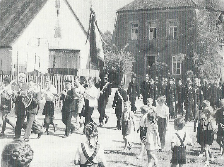 nationalsozialistischen Zeit berührt. Im Protokoll vom 4. Januar 1936 findet sich der Satz: „Es wurde beschlossen wegen Angliederung der Ortsfeuerwehr an die Gemeindefeuerwehr am Samstag, den 18.